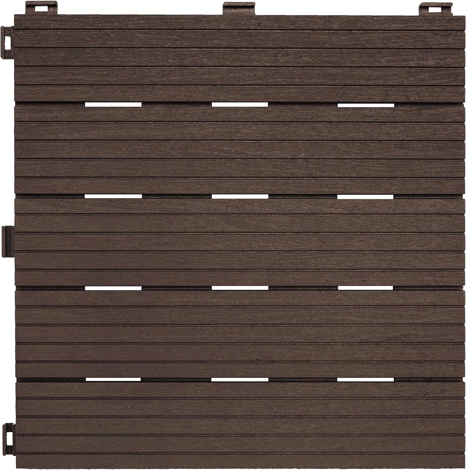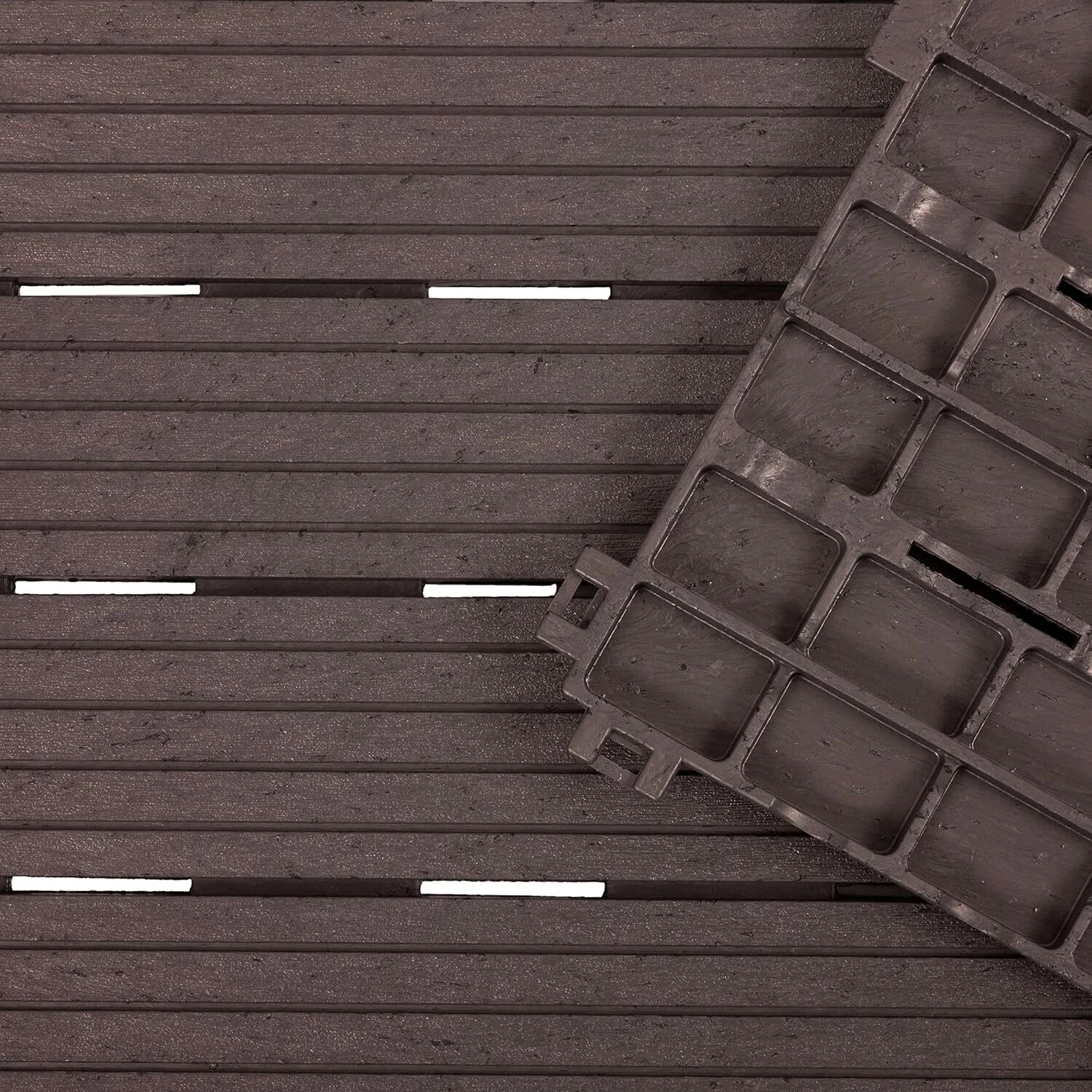 The quick-click connection system is as easy as 1, 2, and 3! Just place your tile on any flat surface, such as concrete or existing decking, align the next tile beside the first one, and press connection tabs down firmly by hand or with a rubber mallet.